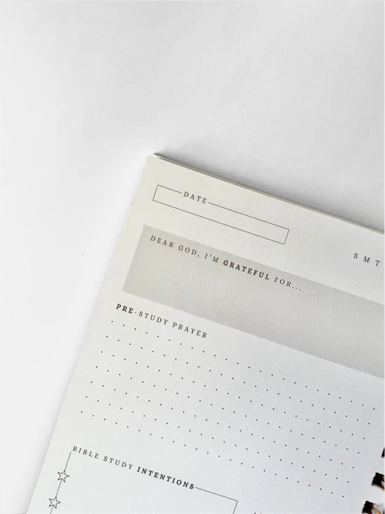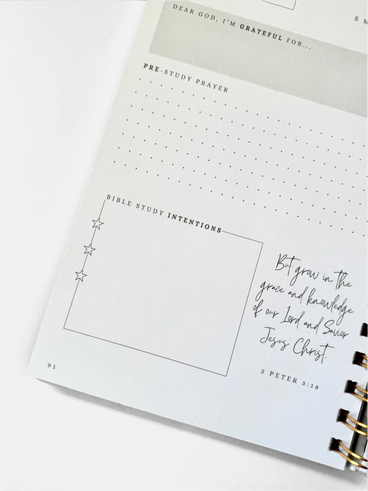 Gentle prompts like gratitude, prayer, and study intentions create a peaceful anchor — while leaving space for your own words, reflections, and prayers.